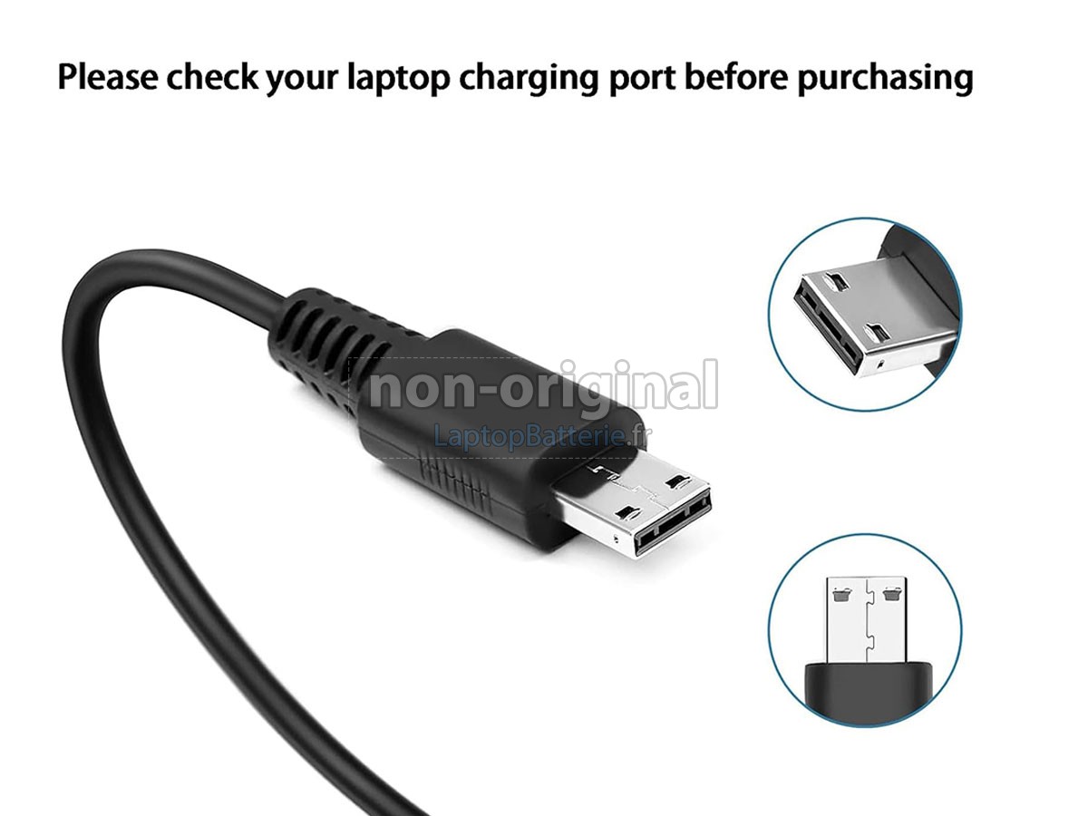 Consultez les informations sur l'adaptateur d'origine, y compris la tension d'entrée, la tension de sortie, le courant/puissance de sortie, et le type de connecteur.