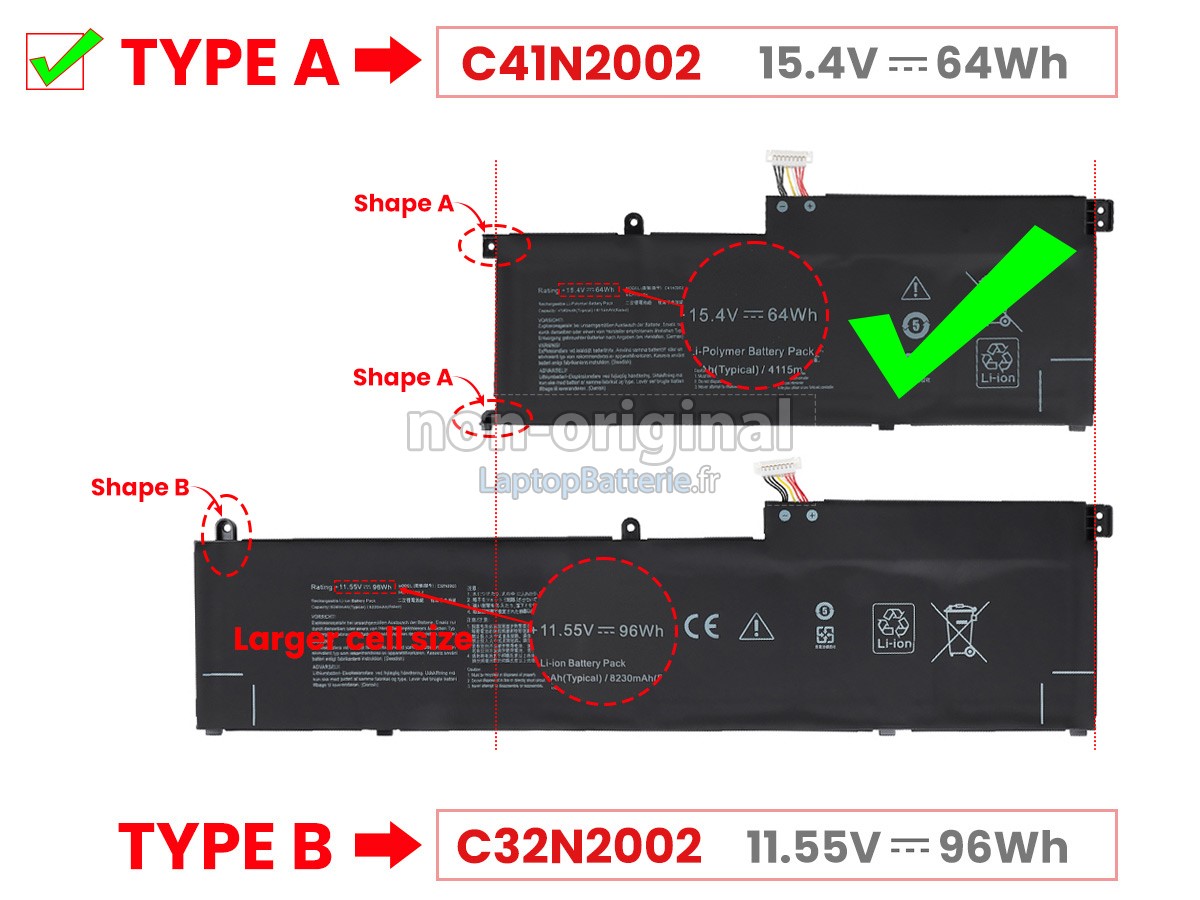 Vous besoin de trouver nom du modèle pour votre ordinateur de portable ou numéro partiel de votre ancienne batterie(e.g. "0B200-03770100"), ensuite vérifier si les batteries sont dans le table "Compatibles Modèles " ou le table "Compatible partie de la batterie".