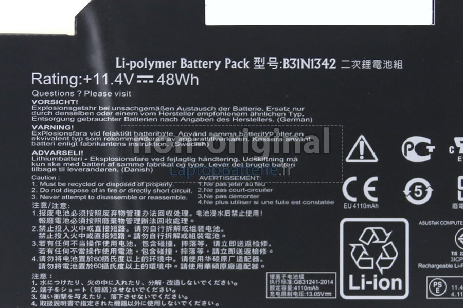 Batterie pour Asus B31N1342 est une produit de haute-qualité, supérieur performance, elle est 100% compatible et elle répondra ou dépassera les spécifications de la batterie d'origine. Pour garantir la meillure performance, la batterie est désignée dans une protection de sécurité d'intelligence multiple et adoptée le carter plastique ingifugeant ABS, puce IC de protection originale, batteries lithium-ion de marque.