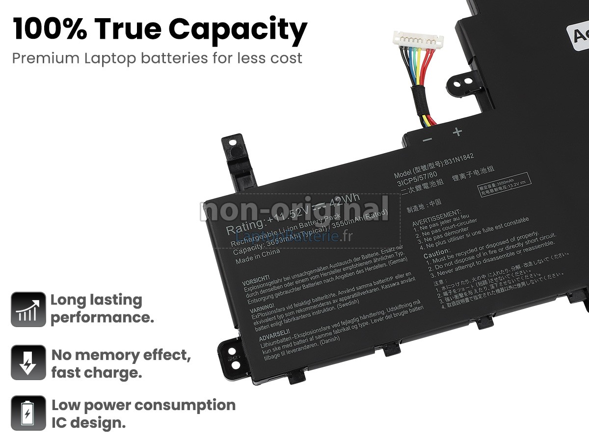 Batterie pour Asus B31N1842 est une produit de haute-qualité, supérieur performance, elle est 100% compatible et elle répondra ou dépassera les spécifications de la batterie d'origine. Pour garantir la meillure performance, la batterie est désignée dans une protection de sécurité d'intelligence multiple et adoptée le carter plastique ingifugeant ABS, puce IC de protection originale, batteries lithium-ion de marque.