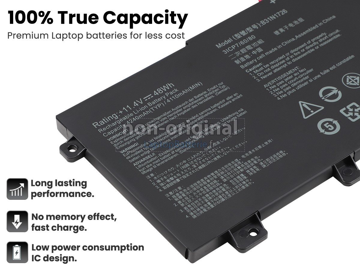Nous offrons 12 mois de garantie pour le remplacement de batterie pour ordinateur portable de Asus TUF GAMING A15 TUF506IH-RS53! Pendant cette période, si votre batterie tombe en panne à cause de problèmes de qualité, nous vous remplaçerons votre batterie avec une autre.