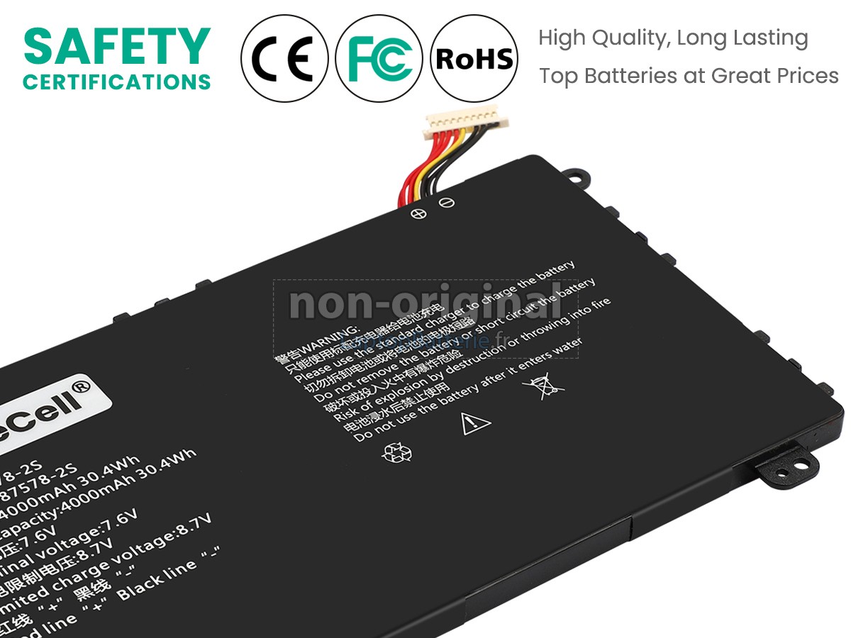 Nos exigences pour la performance de sécurité sont extrêment strictes, et chaque batterie de remplacement pour AXIOO 587578 a parcouru plus de centaine tests stricts sur la qualité et la sécurité. Pour une chose plus importante, nos batteries d'ordinateur portable AXIOO 587578 sont vendues directement sur Internet, sans aucun profit d'agent compris. Du coup, le prix que vous avez découvert sur notre Internet sera généralement 20-50% plus bas que nos concurrents. Si vous découvrez un produit moins cher sur l'Internet de notre concurrent, veuillez laisser nous savoir et nous résoudrons ce problème pour toi.