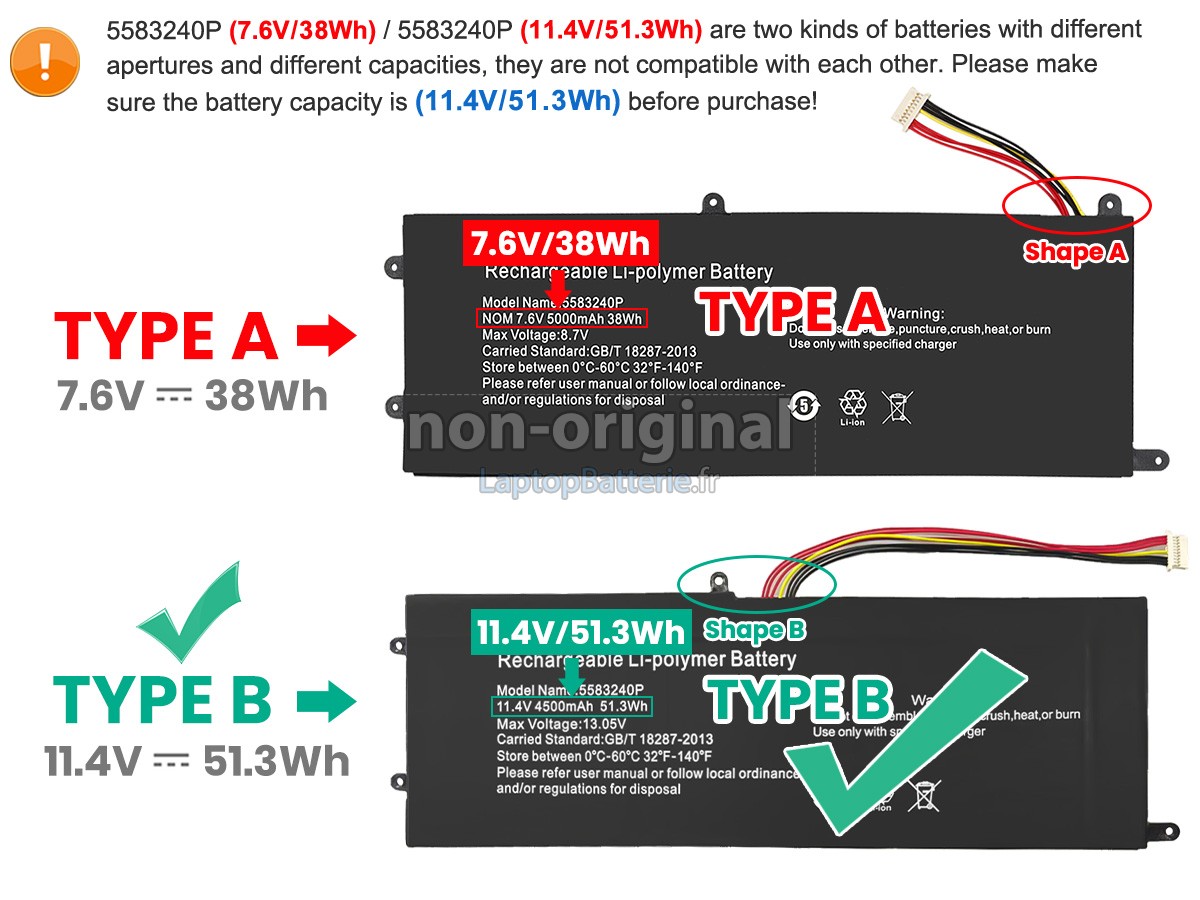 Vous besoin de trouver nom du modèle pour votre ordinateur de portable ou numéro partiel de votre ancienne batterie(e.g. "5583240P"), ensuite vérifier si les batteries sont dans le table "Compatibles Modèles " ou le table "Compatible partie de la batterie".