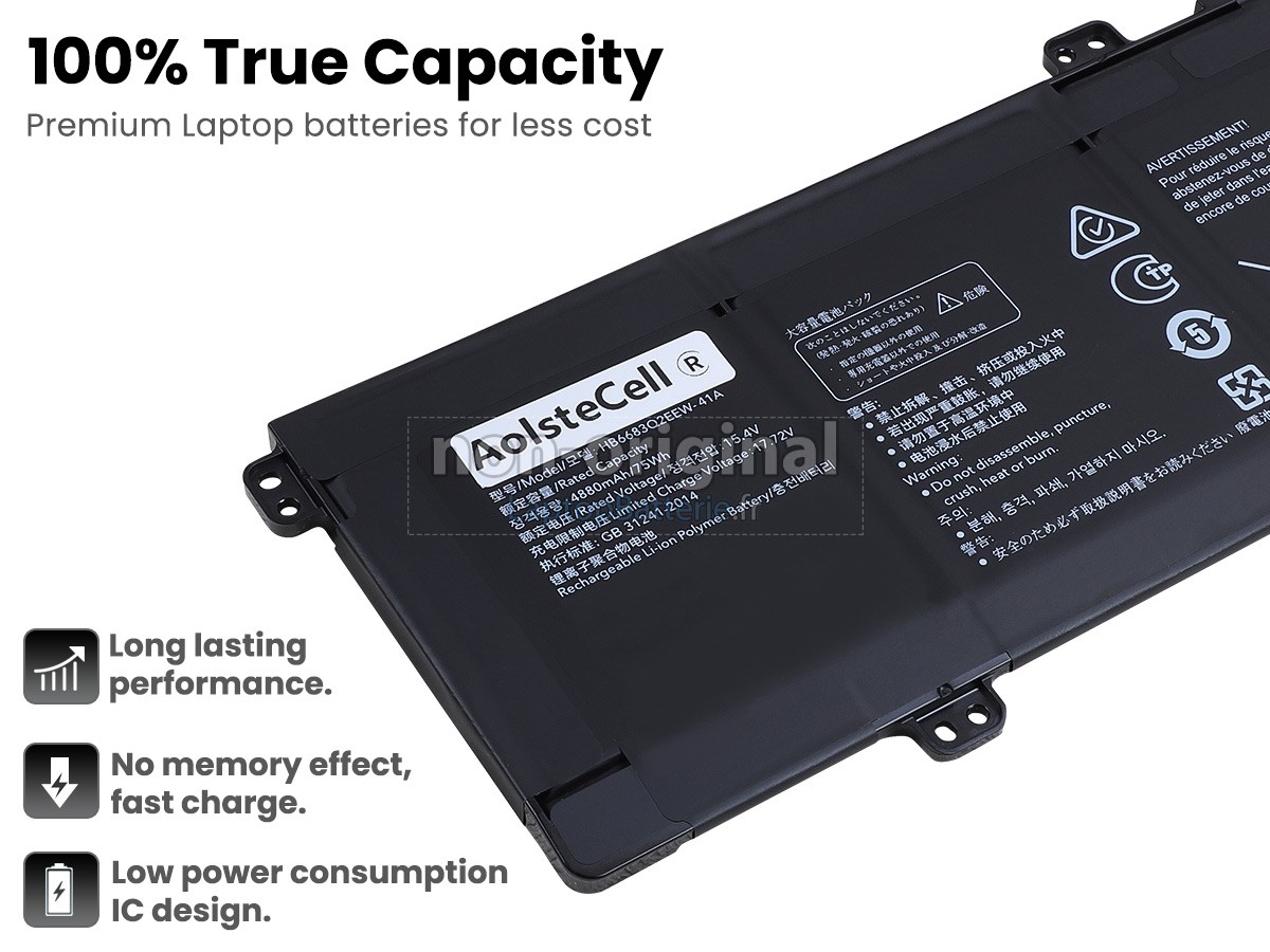 Nos exigences pour la performance de sécurité sont extrêment strictes, et chaque batterie de remplacement pour Huawei HB6683Q2EEW-41C a parcouru plus de centaine tests stricts sur la qualité et la sécurité. Pour une chose plus importante, nos batteries d'ordinateur portable Huawei HB6683Q2EEW-41C sont vendues directement sur Internet, sans aucun profit d'agent compris. Du coup, le prix que vous avez découvert sur notre Internet sera généralement 20-50% plus bas que nos concurrents. Si vous découvrez un produit moins cher sur l'Internet de notre concurrent, veuillez laisser nous savoir et nous résoudrons ce problème pour toi.