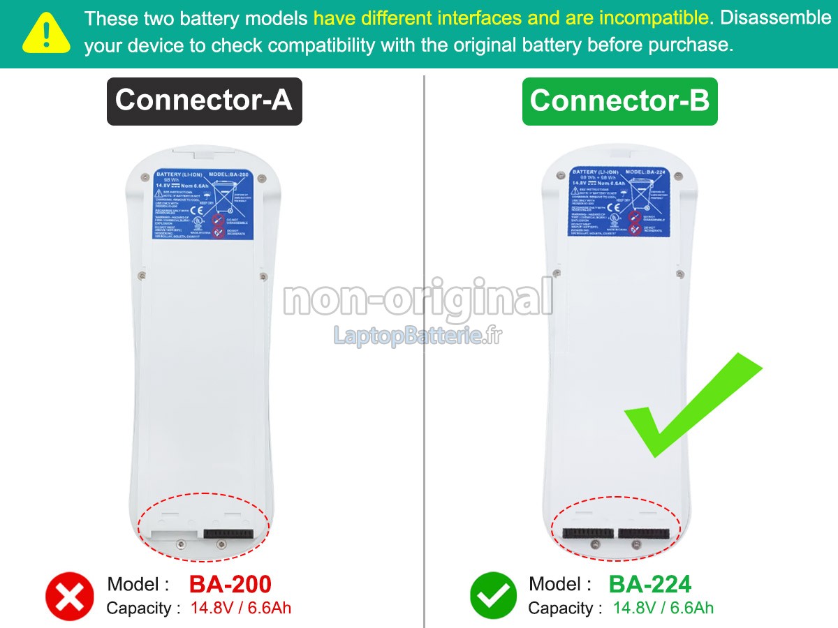 Nos exigences pour la performance de sécurité sont extrêment strictes, et chaque batterie de remplacement pour Inogen BA-203 a parcouru plus de centaine tests stricts sur la qualité et la sécurité. Pour une chose plus importante, nos batteries Inogen BA-203 sont vendues directement sur Internet, sans aucun profit d'agent compris. Du coup, le prix que vous avez découvert sur notre Internet sera généralement 20-50% plus bas que nos concurrents. Si vous découvrez un produit moins cher sur l'Internet de notre concurrent, veuillez laisser nous savoir et nous résoudrons ce problème pour toi.