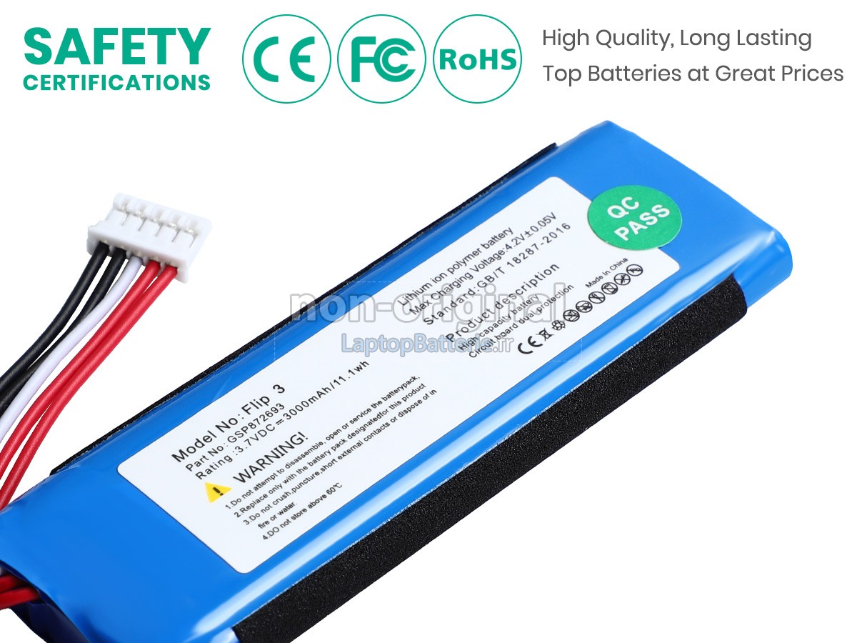 Nos exigences pour la performance de sécurité sont extrêment strictes, et chaque batterie de remplacement pour JBL FLIP 3 PORTABLE SPEAKER a parcouru plus de centaine tests stricts sur la qualité et la sécurité. Pour une chose plus importante, nos batteries JBL FLIP 3 PORTABLE SPEAKER sont vendues directement sur Internet, sans aucun profit d'agent compris. Du coup, le prix que vous avez découvert sur notre Internet sera généralement 20-50% plus bas que nos concurrents. Si vous découvrez un produit moins cher sur l'Internet de notre concurrent, veuillez laisser nous savoir et nous résoudrons ce problème pour toi.