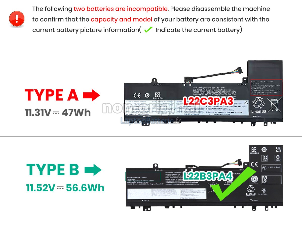 Vous besoin de trouver nom du modèle pour votre ordinateur de portable ou numéro partiel de votre ancienne batterie(e.g. "IdeaPad SLIM 5 14ABR8-82XE006UFR"), ensuite vérifier si les batteries sont dans le table "Compatibles Modèles " ou le table "Compatible partie de la batterie".