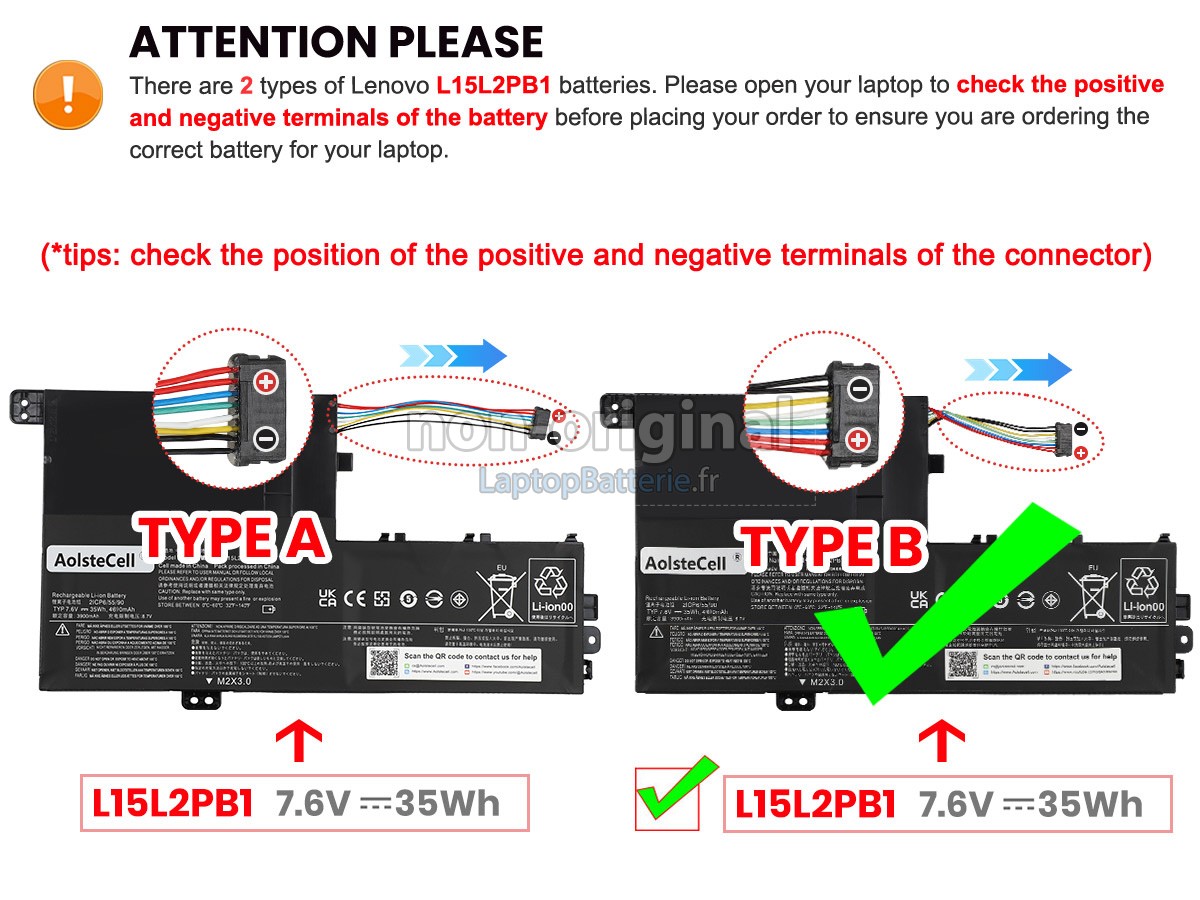 Vous besoin de trouver nom du modèle pour votre ordinateur de portable ou numéro partiel de votre ancienne batterie(e.g. "L15L2PB1(2ICP6/55/90)"), ensuite vérifier si les batteries sont dans le table "Compatibles Modèles " ou le table "Compatible partie de la batterie".