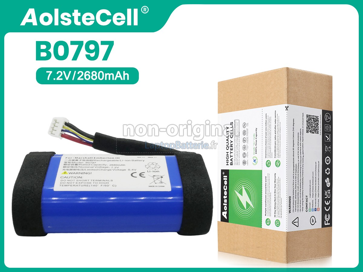 Nos exigences pour la performance de sécurité sont extrêment strictes, et chaque batterie de remplacement pour Marshall B0797 a parcouru plus de centaine tests stricts sur la qualité et la sécurité. Pour une chose plus importante, nos batteries Marshall B0797 sont vendues directement sur Internet, sans aucun profit d'agent compris. Du coup, le prix que vous avez découvert sur notre Internet sera généralement 20-50% plus bas que nos concurrents. Si vous découvrez un produit moins cher sur l'Internet de notre concurrent, veuillez laisser nous savoir et nous résoudrons ce problème pour toi.