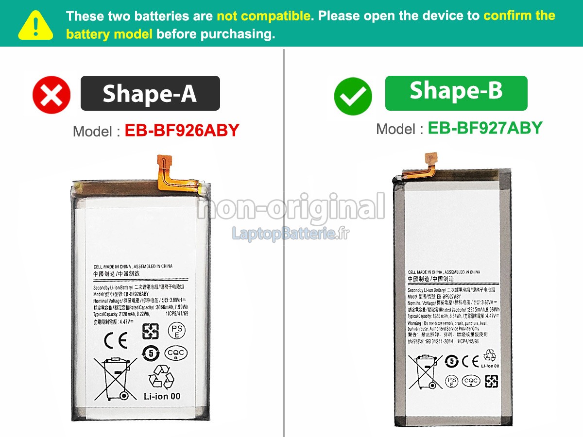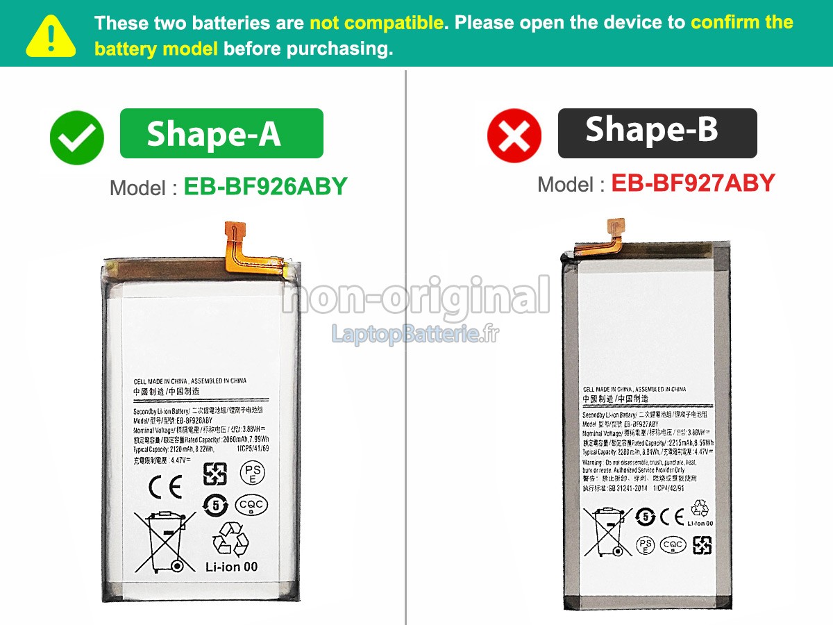 Nos exigences pour la performance de sécurité sont extrêment strictes, et chaque batterie de remplacement pour Samsung GALAXY Z FOLD 3 5G 7.6INCH SM-F9260 a parcouru plus de centaine tests stricts sur la qualité et la sécurité. Pour une chose plus importante, nos batteries Samsung GALAXY Z FOLD 3 5G 7.6INCH SM-F9260 sont vendues directement sur Internet, sans aucun profit d'agent compris. Du coup, le prix que vous avez découvert sur notre Internet sera généralement 20-50% plus bas que nos concurrents. Si vous découvrez un produit moins cher sur l'Internet de notre concurrent, veuillez laisser nous savoir et nous résoudrons ce problème pour toi.