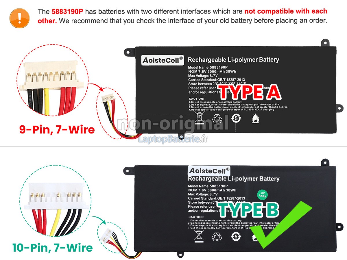 Vous besoin de trouver nom du modèle pour votre ordinateur de portable ou numéro partiel de votre ancienne batterie(e.g. "5883190P"), ensuite vérifier si les batteries sont dans le table "Compatibles Modèles " ou le table "Compatible partie de la batterie".