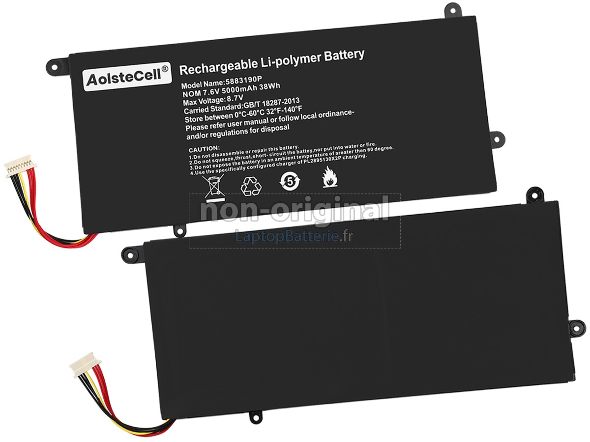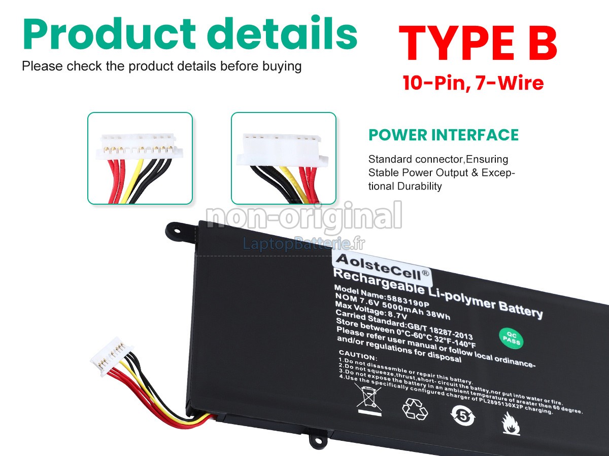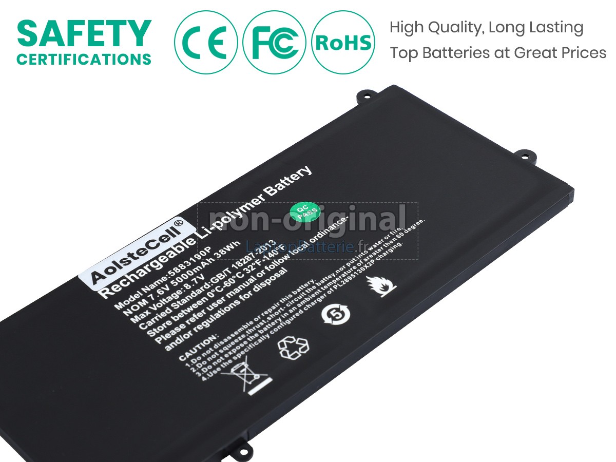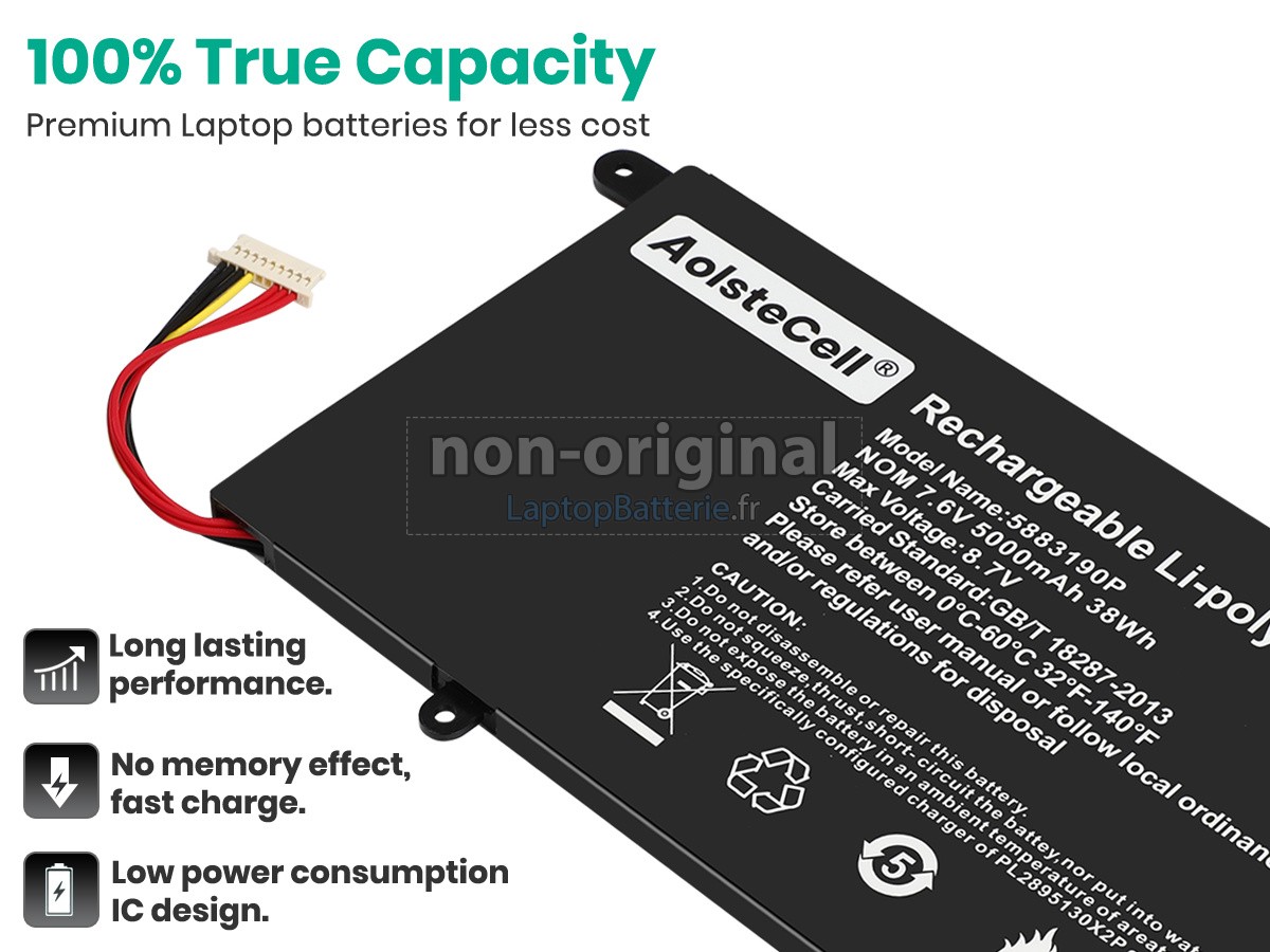 Nos exigences pour la performance de sécurité sont extrêment strictes, et chaque batterie de remplacement pour Vastking 5883190P a parcouru plus de centaine tests stricts sur la qualité et la sécurité. Pour une chose plus importante, nos batteries d'ordinateur portable Vastking 5883190P sont vendues directement sur Internet, sans aucun profit d'agent compris. Du coup, le prix que vous avez découvert sur notre Internet sera généralement 20-50% plus bas que nos concurrents. Si vous découvrez un produit moins cher sur l'Internet de notre concurrent, veuillez laisser nous savoir et nous résoudrons ce problème pour toi.