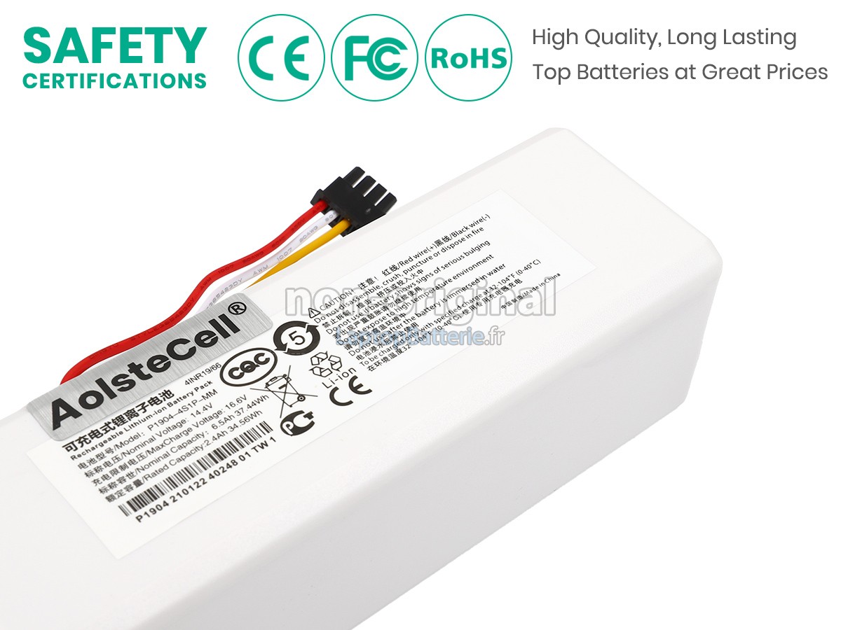 Nos exigences pour la performance de sécurité sont extrêment strictes, et chaque batterie de remplacement pour XiaoMi P1904-4S1P-MM a parcouru plus de centaine tests stricts sur la qualité et la sécurité. Pour une chose plus importante, nos batteries aspirateur XiaoMi P1904-4S1P-MM sont vendues directement sur Internet, sans aucun profit d'agent compris. Du coup, le prix que vous avez découvert sur notre Internet sera généralement 20-50% plus bas que nos concurrents. Si vous découvrez un produit moins cher sur l'Internet de notre concurrent, veuillez laisser nous savoir et nous résoudrons ce problème pour toi.
